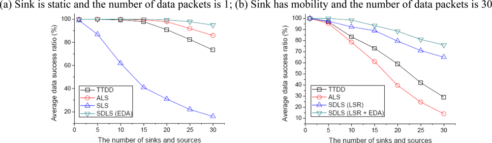 Figure 9 depicts the average data success ratio, as the number of sinks and source nodes increases from 0 to 30 in increments of 5. From Figure 9(a), we assume that the sink is static and the source generates data packets only once with an initial energy of 0.1J. As shown in the figure, SLS has the lowest data success ratio. Here we can see that SLS has difficulty obtaining location information regardless of mobile sinks. Except for SLS, as shown in the figure, the average data success ratio decreases when the number of sinks and source nodes is over 15. However, SDLS still has a high success ratio, even when the number of sinks and source nodes is 30. From Figure 9(b), we assume that the sink speed is 10 m/s and the source node is generated 30 times with an initial energy of 1J. ALS has the worst data success ratio, as ALS has to continuously relay data, while SDLS provides the shortest path through the LSR for data transmission.