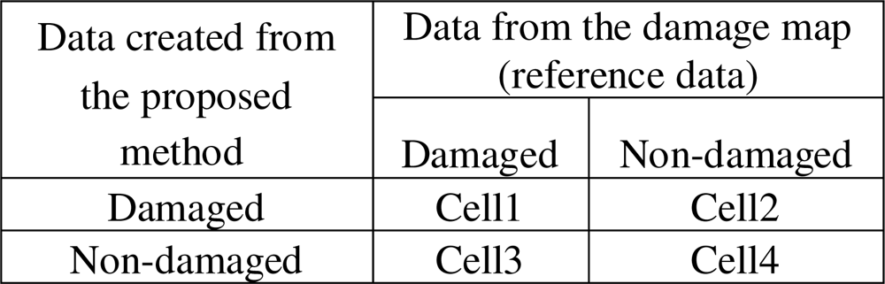 Each block has four values corresponding to parcels identified as damaged both in the damage map and with the proposed method (cell 1), parcels identified as non-damaged both in the damage map and with the proposed method (cell 4), parcels identified as damaged in the damage map but non-damaged with the proposed method (cell 3) and parcels identified as non-damaged in the damage map but damaged with the proposed method (cell 2). Overall accuracy of each block was calculated by summing diagonal elements and dividing them to total number of parcels within that block. The equation of the overall accuracy for a block based on the values described in Figure 2 is as follows: