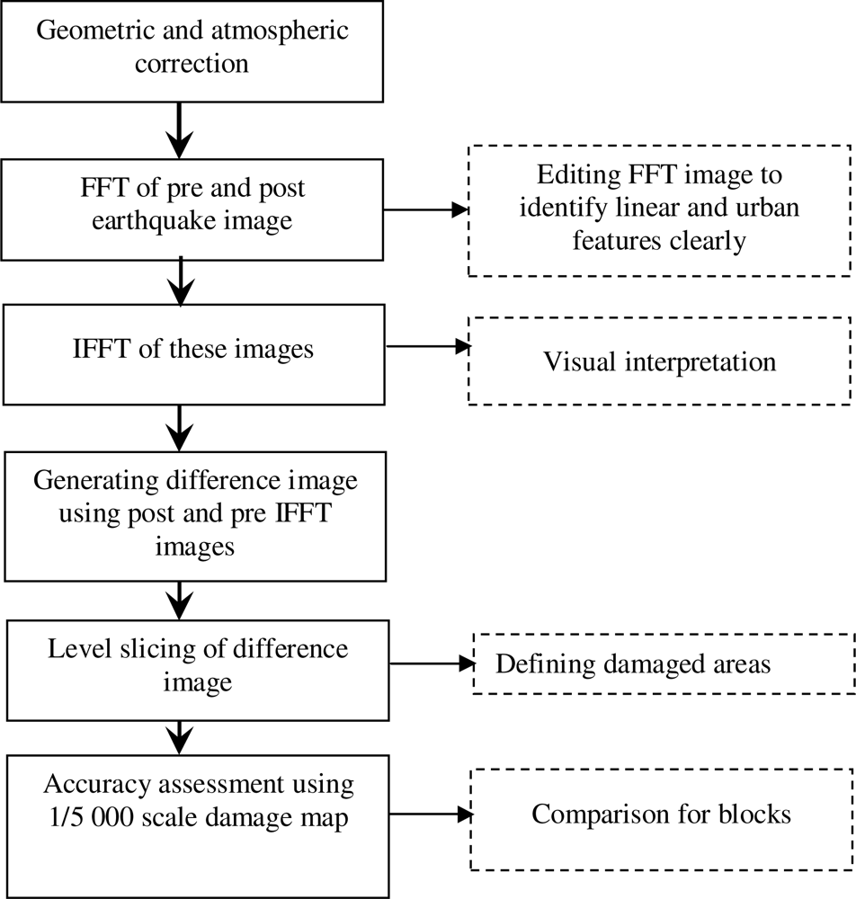In this study, the following steps were conducted to accurately identify the location and magnitude of earthquake induced damages in an urban area and to quantify the accuracy of the proposed method: (i) pre- and post-earthquake images of the region were geometrically and atmospherically corrected, (ii) Fast Fourier Transform (FFT) was applied to pre- and post-earthquake images and images were filtered in the frequency domain, (iii) a difference image was generated using Inverse Fast Fourier Transform (IFFT)-pre- and post-earthquake data, (iv) level slicing method was applied to difference image to identify the earthquake-induced damages, (v) accuracy assessment was performed by comparing the results of the proposed method with the 1/5,000 scale damage map of the earthquake area.