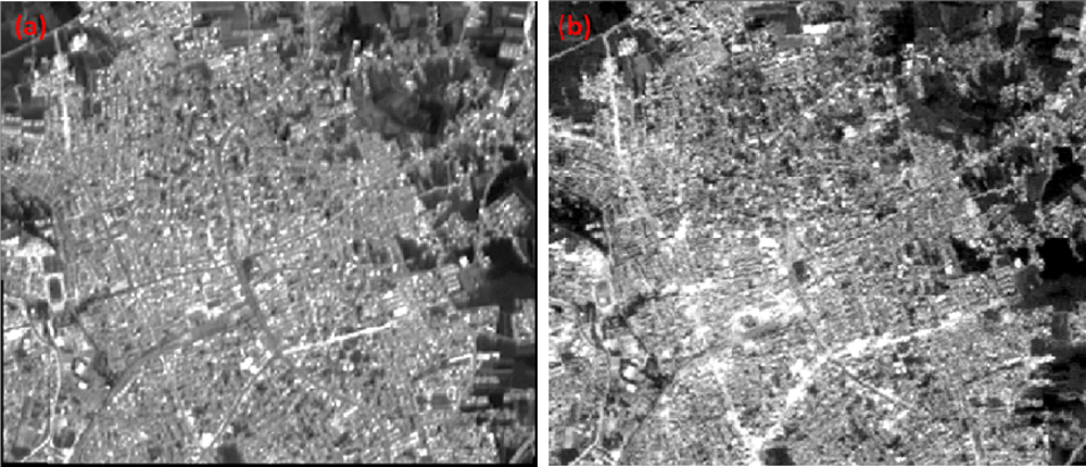 Both images were first geometrically corrected into Universal Transverse Mercator (UTM) projection using first order polynomials and appropriate Ground Control Points (GCP) collected from topographic maps. Then, radiometric normalization was employed using a histogram matching algorithm.