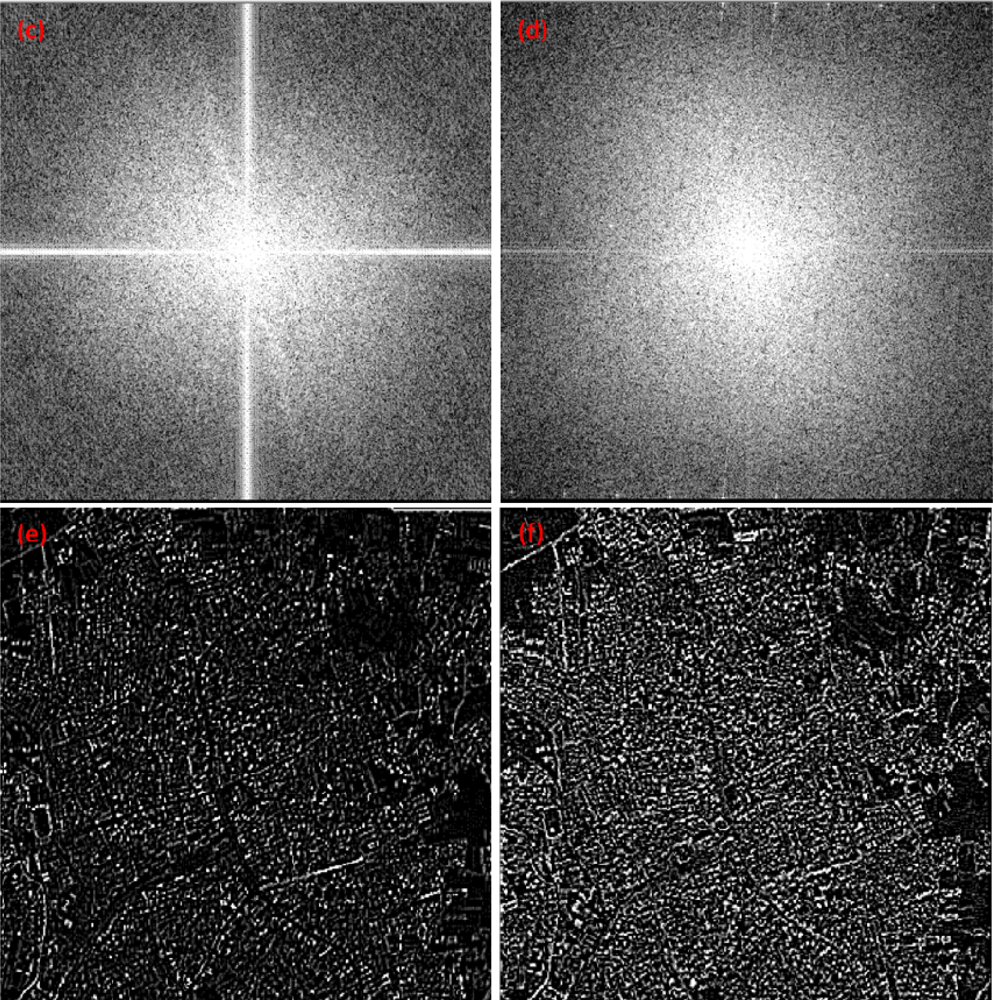 The original pre- and post-earthquake images are shown in Figures 4 a and b and the FFT images generated from these data are illustrated in Figures 4 c and d. As a result of collapsed buildings and roads, spatial structure and texture of the post-earthquake image had changed. This caused differences in spatial frequency which can be determined via Fourier Transform. The differences in spatial frequency for pre- and post-earthquake data can be identified from Figures 4 c and d.