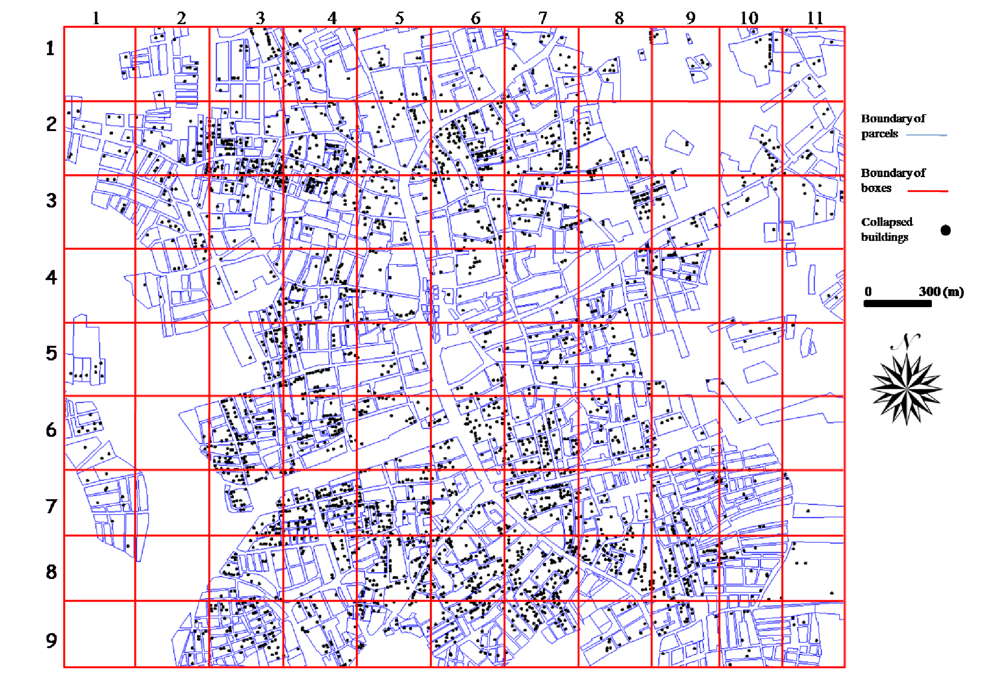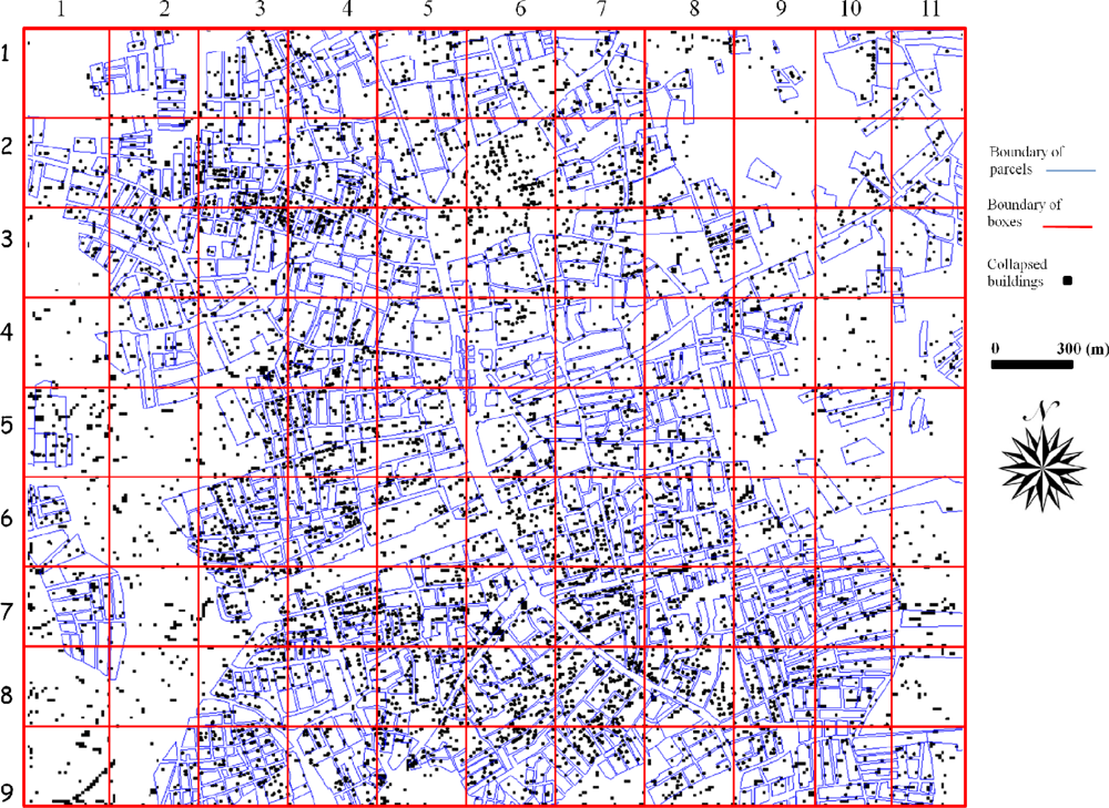In most cases parcels identified as damaged in the damage map but non-damaged with the proposed method (cell 3) occurred because there were only one or two collapsed buildings within a parcel which could not be identified using SPOT images. Block 1–2, 1–3, 1–10, 4–5 are examples of this situation. On the other hand, most of the parcels having more than three collapsed buildings were easily identified using the proposed method. Higher resolution satellite images should be used to identify collapsed buildings individually.