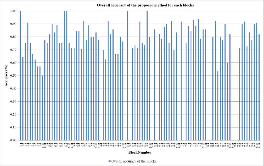 The overall accuracy of each block ranges from 50 % to 100 % (Figure 7). Most of the blocks have accuracy value higher than 75 %. The minimum accuracy was obtained for Block 1–10, because there are three damaged parcels and two of these parcels include only one collapsed building which is hard to identify with current spatial resolution. Most of the parcels which have plenty of collapsed buildings were easily identified with 75 % or higher accuracy.