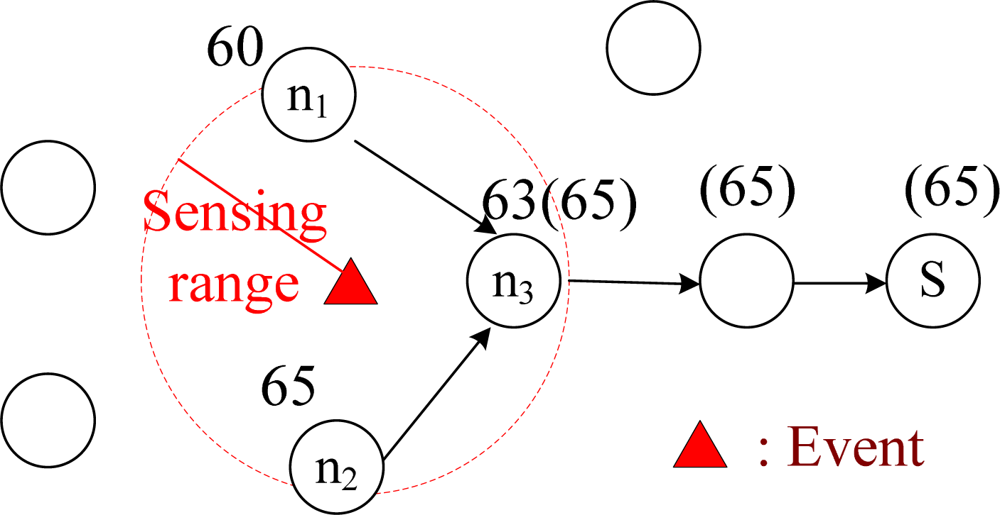 data source nodes) around this event will sense the event, and then send the data back to one sensor node (denoted as
