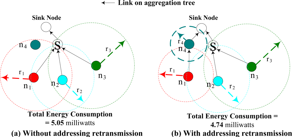 S, and thus, the retransmission times caused by collision could be significantly reduced. Hence, the energy consumption associated with retransmission from collisions should be carefully addressed in WSN. This example also shows that a good tradeoff between data aggregation and retransmission is facilitated by intelligent transmission radius and routing assignments. The energy consumption function (including transmission power and retransmission power), as shown in