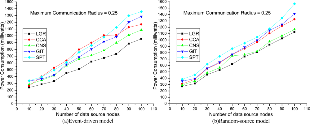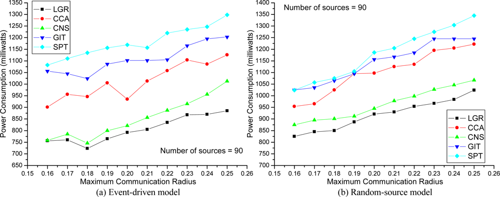 Figure 4, the effects of communication radii on energy consumption are examined with 90 data source nodes. As shown, the LGR algorithm can still obtain best solution quality, as compared to the other heuristics on both models. Interestingly, even though a large maximum communication radius could increase the probability of data aggregation, it is shown that a large maximum communication radius did not offer any advantage for MAC aware energy efficient data aggregation trees, because a large communication radius leads to severe collisions that could jeopardize the advantages of data aggregation. In addition, in an event-driven model, the best solution for the LGR algorithm is at 0.18, instead of at 0.16 communication radius. This reveals that; for too small communication radii, even though the collision probability is low, it will not provide data aggregation advantages that save total transmission power. Hence, best communication radii setting should consider the tradeoff between collision and data aggregation.