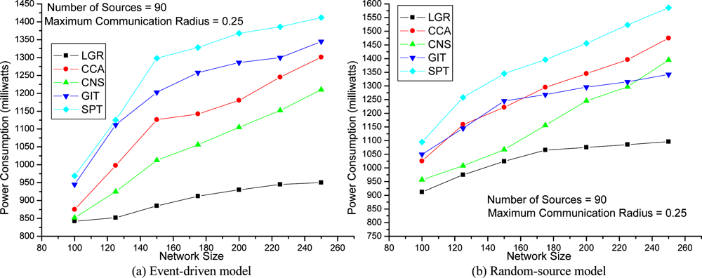 Figure 3 shows the total energy consumption with increasing numbers of data source nodes. When the number of source nodes is large, the aggregation tree is larger. It is shown that the LGR algorithm can obtain the best solution quality, as compared to other heuristics in both event-driven and random-source models. In addition, in an event-driven model, the solution quality of LGR algorithm is even more significant than other heuristics. This is because in an event-driven model, the data source nodes are clustered to increase probability of collisions. Hence, heuristic algorithms that do not address the MAC collision suffer from severe retransmission occurrences.