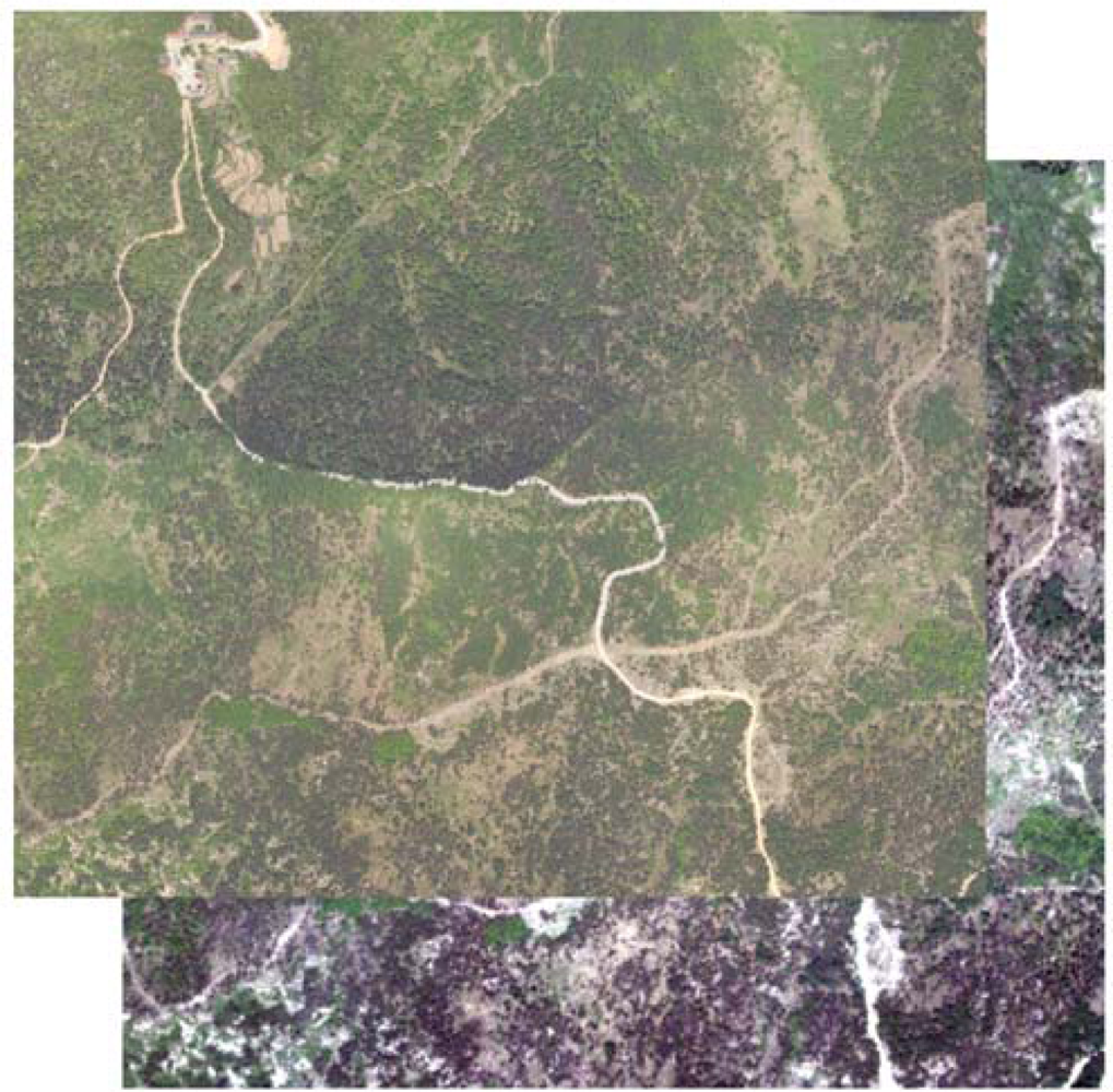 9 show high resolution airborne imagery and true color imagery rasterized from the RGB intensity of LiDAR returns, respectively. 141 pairs of control points were selected using the SIFT algorithm and a cubic polynomial was used to match the rasterized RGB to the high resolution airborne imagery.