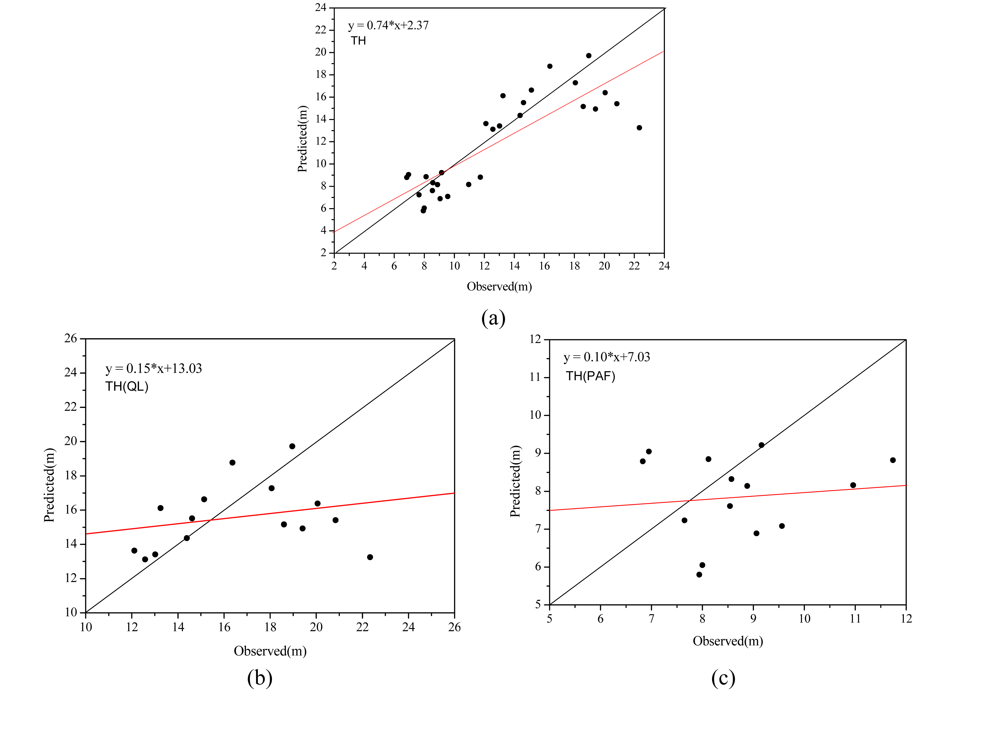 Figure 13, tree heights for conifers and broadleaves are in distinct categories, which contribute to a high correlation when the trees are combined. The R coefficient, RMSE and MD are 0.83, 2.78 and −0.97 m, respectively, though most predicted values are lower than measured values (−0.97 m). As for individual species, tree heights of conifer trees have a smaller RMSE and MD (1.81 m and −0.85 m) than those of broadleaf trees (3.45 m and −1.07 m). However, the correlation between measured and predicted tree heights of broadleaf is greater than that of conifer trees (0.26 for broadleaf trees and 0.12 for conifer trees).