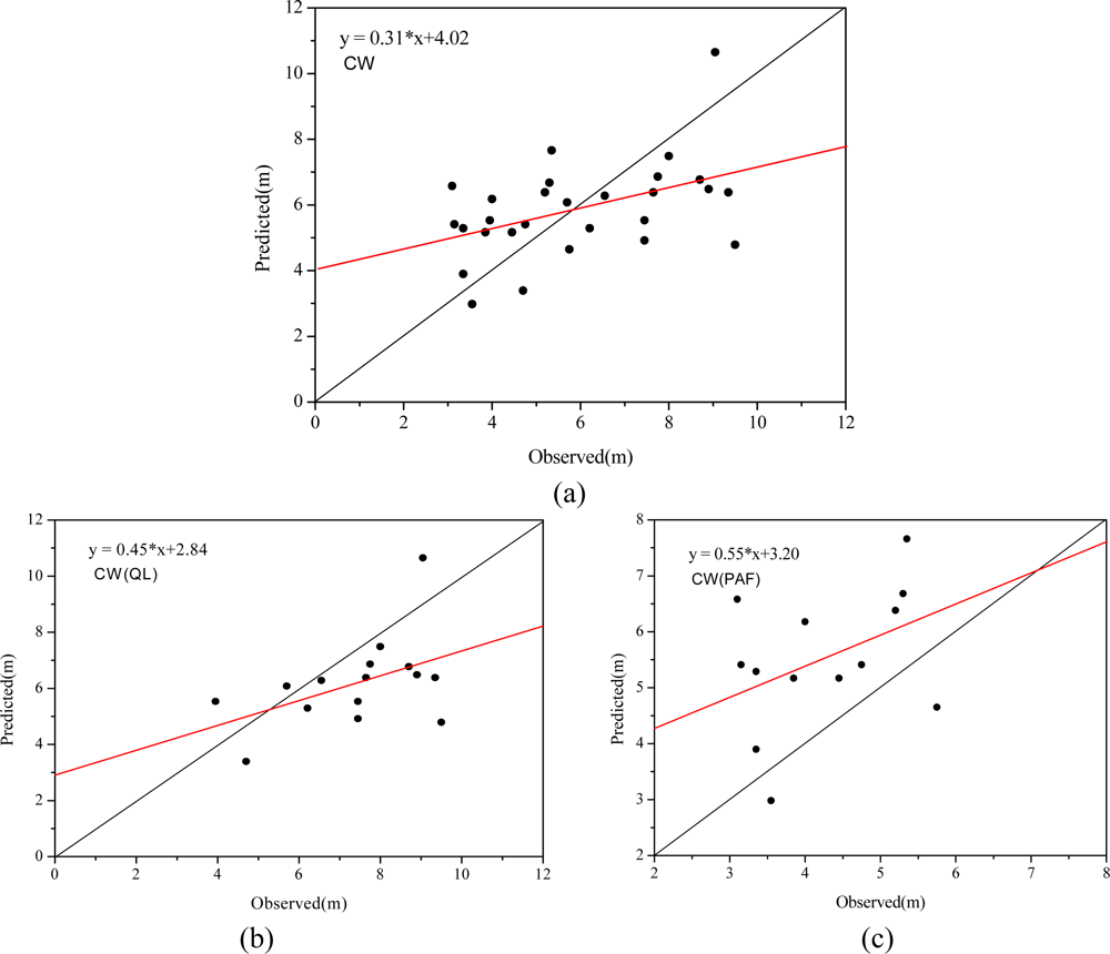 Goodness-of-fit statistics and scatter plots between measured and predicted crown width from the CHM for broadleaf, conifer and combined trees are shown in