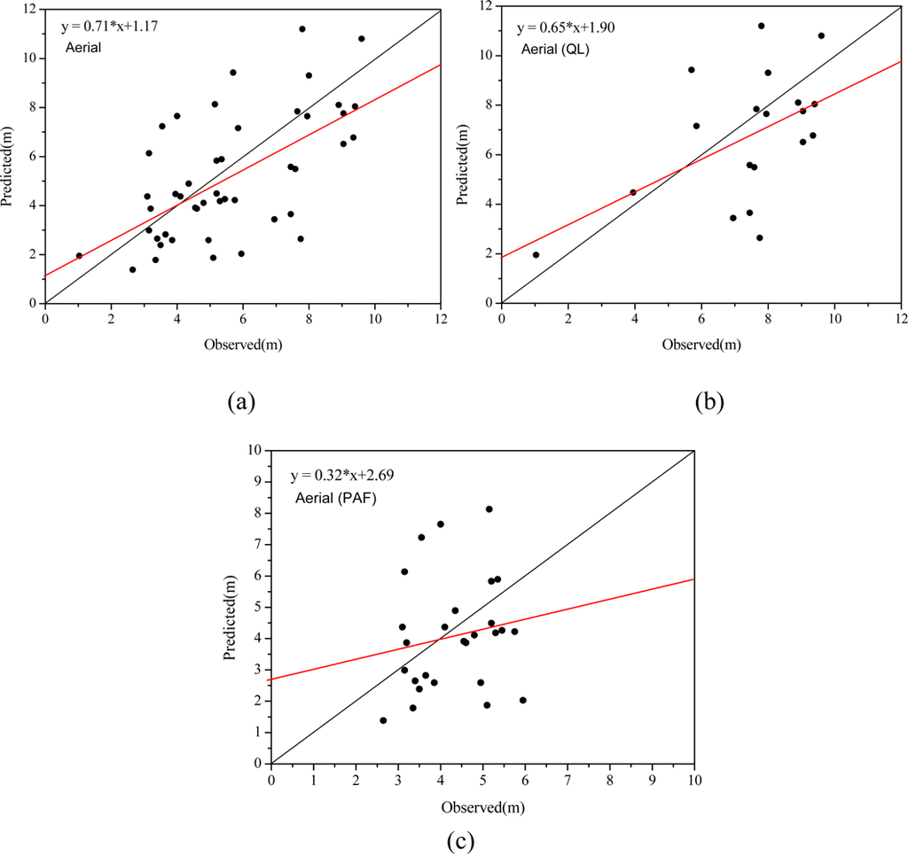 Table 4, the R coefficient, RMSE and MD are 0.46, 1.88 m and −0.01 m, respectively, for combined species. Goodness-of-fit statistics of broadleaf and conifer are compared in