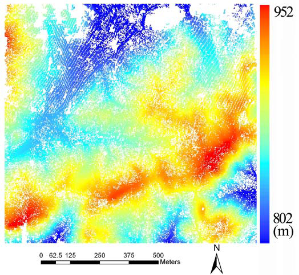 The LiDAR point cloud filtering is of primary importance for CHM generation. The morphological filtering algorithm used in this paper achieved mixed results when compared to field estimated values. While the extracted heights seemed to underestimate the field observed values (especially for broadleaf trees), it is just as valid to assume that the field observations over-estimated tree heights. As field estimation of tree heights can be difficult and notoriously inaccurate, we feel it is prudent to exercise caution in using field observed values as “ground truth.” Our results indicate disagreement between LiDAR extracted heights and field estimated heights, but it is difficult to determine which data set is more accurate. It may be possible to increase the accuracy of LiDAR height extraction by incorporating additional information to the automatic filtering algorithm. The filter could be more adaptive by incorporating intensity and contextual information from aerial images and LiDAR point cloud data. Another way to increase accuracy of the LiDAR based tree height extraction is to increase the sampling frequency of the LiDAR. A greater number of LiDAR returns per unit area would result in a denser LiDAR point cloud from which a more accurate CHM can be interpolated.