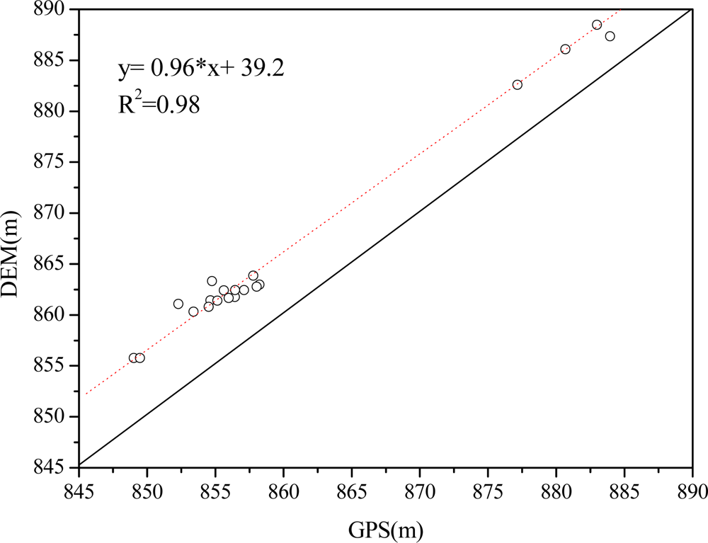 The R squared, RMSE and MD are 0.98, 4.41 and 3.95 m, respectively, and the regression curve is almost parallel to the one to one line. This indicates that the DEM is close to elevation measured by GPS but has a systematic error in it.