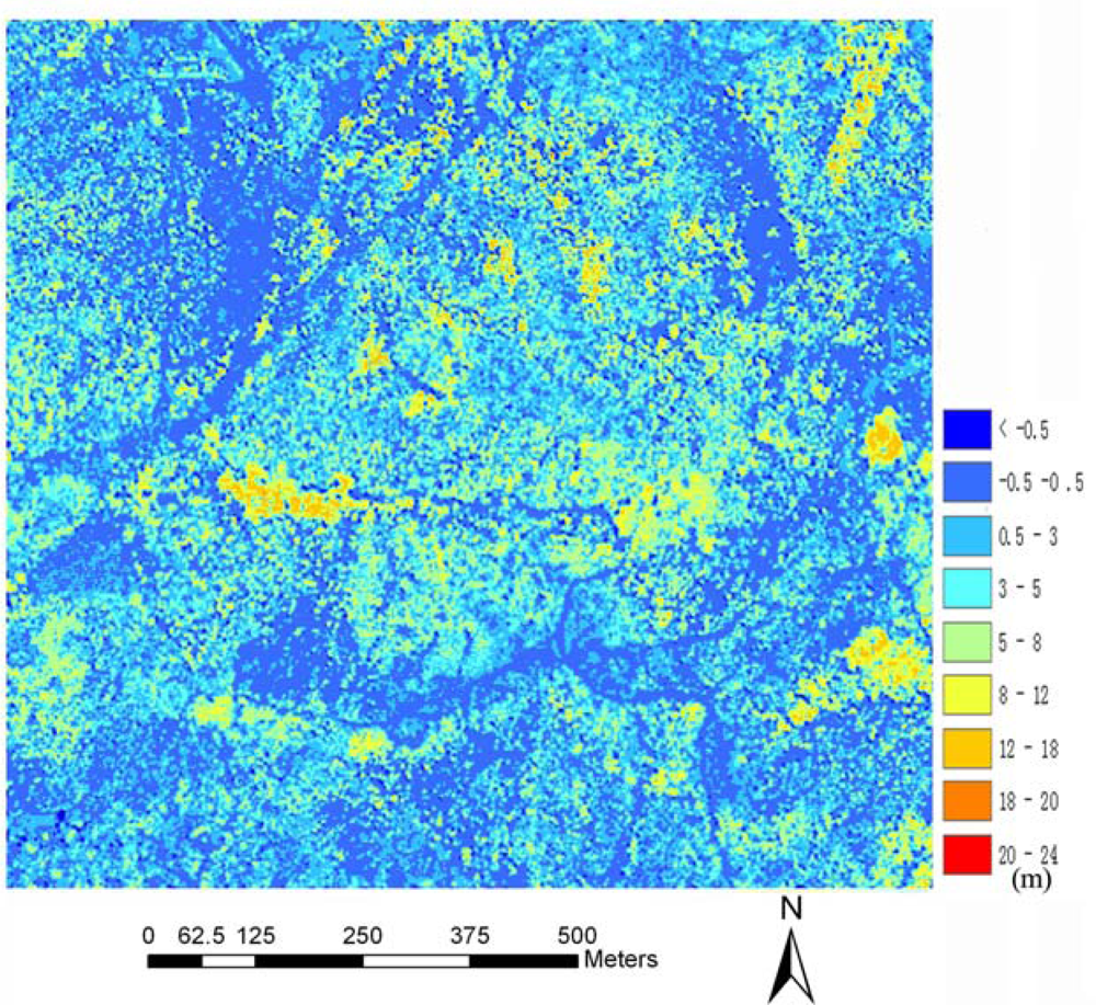 Figure 7, most points have values from −0.5 to 0.5 m. Greater values were colored by yellow and red, which indicate trees in the CHM.
