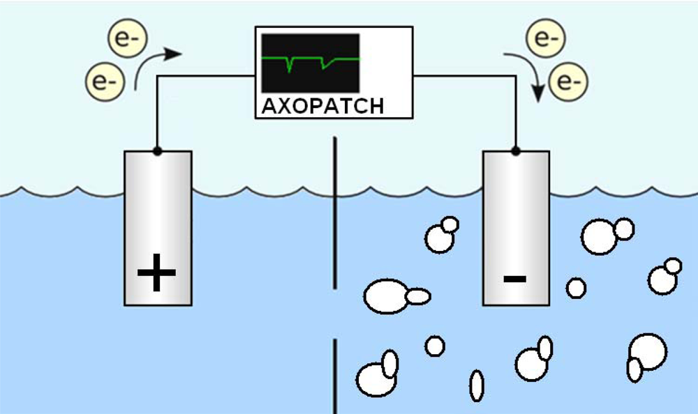 Conceptual illustration of electrolytic flow cell used to rapidly detect and configure yeast. The negatively charged yeast are drawn electrophoretically to the cathode, translocating through the micropore. This translocation causes an increase in the resistance to the ionic flow creating a signature temporary decrease in recorded current (ionic current blockade) relating to the size, configuration, and morphology of the yeast.