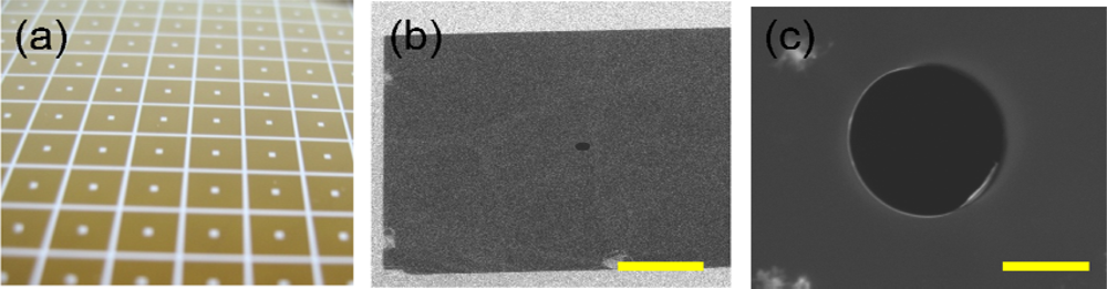 Micropore fabrication: (a) SiN wafer after photolithography and reactive ion etching processes, (b) SEM micrograph of free standing SixNy window after completion of 1.25 μm diameter pore taken at 5k×, 3kV with 52.0° tilt using ion beam on DB 235 focused ion beam (FIB) and (c) up close micrograph of 10 μm diameter pore used in experimentation. The scale bars are 7 μm and 5 μm in (b) and (c), respectively.