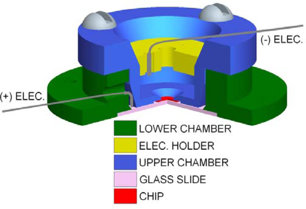 Rendering of experimental flow cell with a 90° radial cut-away for cross-sectional view. Upper chamber (blue), electrode supporting ring (yellow), low chamber (green), micropore chip (red), and glass slide (brown).
