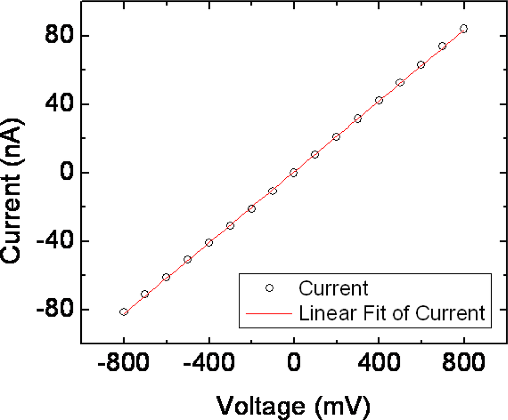 Current voltage characteristics of a 10 μm diameter solid state pore obtained at 0.001M KCl for the Candida albicans detection and configuration experiments. Curve demonstrates Ohmic I–V dependence. Its unobstructed conductance is found to be 100 nS. Error bars are too small to plot.