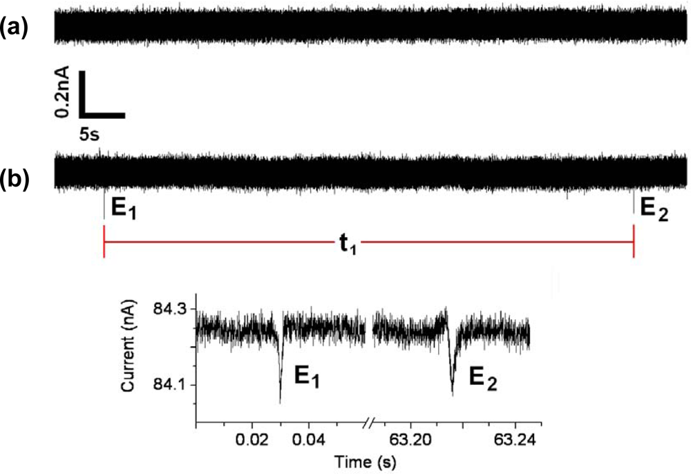 (a) Open conductance of a 10 μm pore at 700 mV applied potential. (b) Yeast translocation events using a 2 × 102 yeasts/ml sample, caused by multiple translocations under a driving voltage of 1000 mV. Analyte concentration is characterized using time interval, t1. in between events E1 and E2. (c) Detailed view of events E1 and E2.