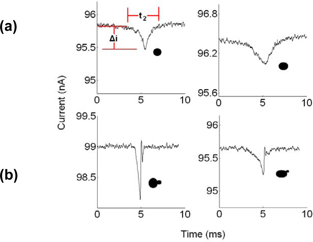 Typical current signatures observed. (a) Two examples of single yeast translocation events recorded using a 10 μm diameter pore. Events are characterized by their individual translocation times, t2, and current amplitudes, Δi. (b) Two examples of budding yeast cell translocations. The inset in both (a) and (b) is an illustration of the probable morphology of the translocating yeast cell.