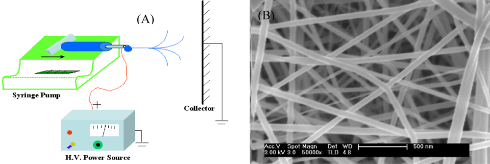 (A) A schematic of electrospinning process. (B) A SEM image of typical electrospun fibers.
