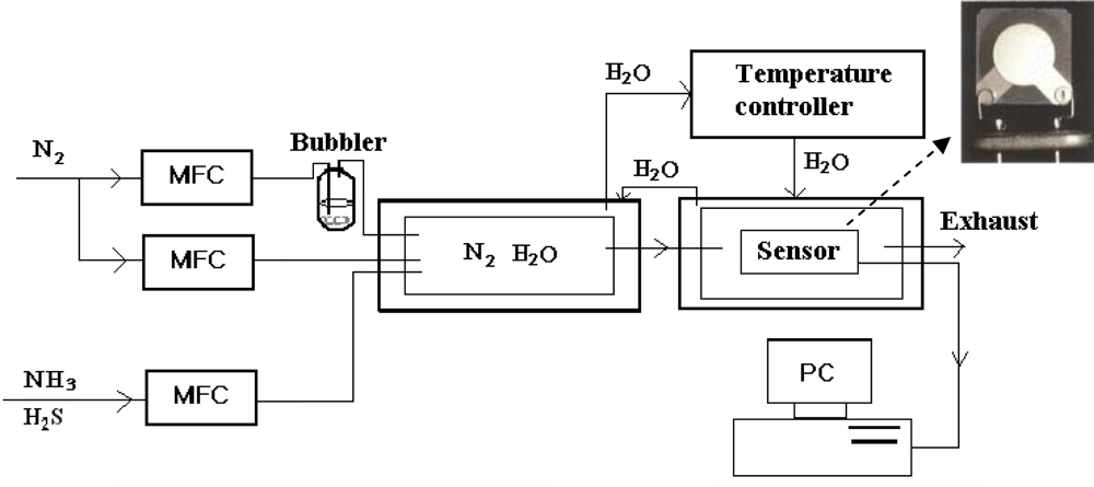Ding et al [] first applied electrospun nanofibrous membranes on QCM electrodes as highly sensitive gas sensors in 2004. A series of composite fibers of polyacrylic acid (PAA) and poly(vinyl alcohol) (PVA) with diameters of 100–400 nm containing various weight percentages of PAA to PVA were deposited on QCM via electrospinning and characterized with regards to their morphology and sensitivity to NH3. PAA, a weak anionic polyelectrolyte, interacts with NH3 gas. However, it is difficult to obtain nanofibers by electrospinning a pure PAA solution because of the formation of strong hydrogen bonds between water and the large amount of carboxyl groups in PAA. Therefore, the water-soluble PVA was introduced as a template to form composite fibers. Subsequently, heat treatment was employed to induce the crosslinking between PAA and PVA for reinforcing the fiber anti-water solubility. Sensing experiments were carried out at room temperature (RT) in a flow-type gas testing system (Figure 2) by measuring the resonance frequency shifts of QCM which due to the additional mass loading. The flow rates of dry N2, wet N2, and ammonia were kept constant by mass flow controllers (MFCs).
