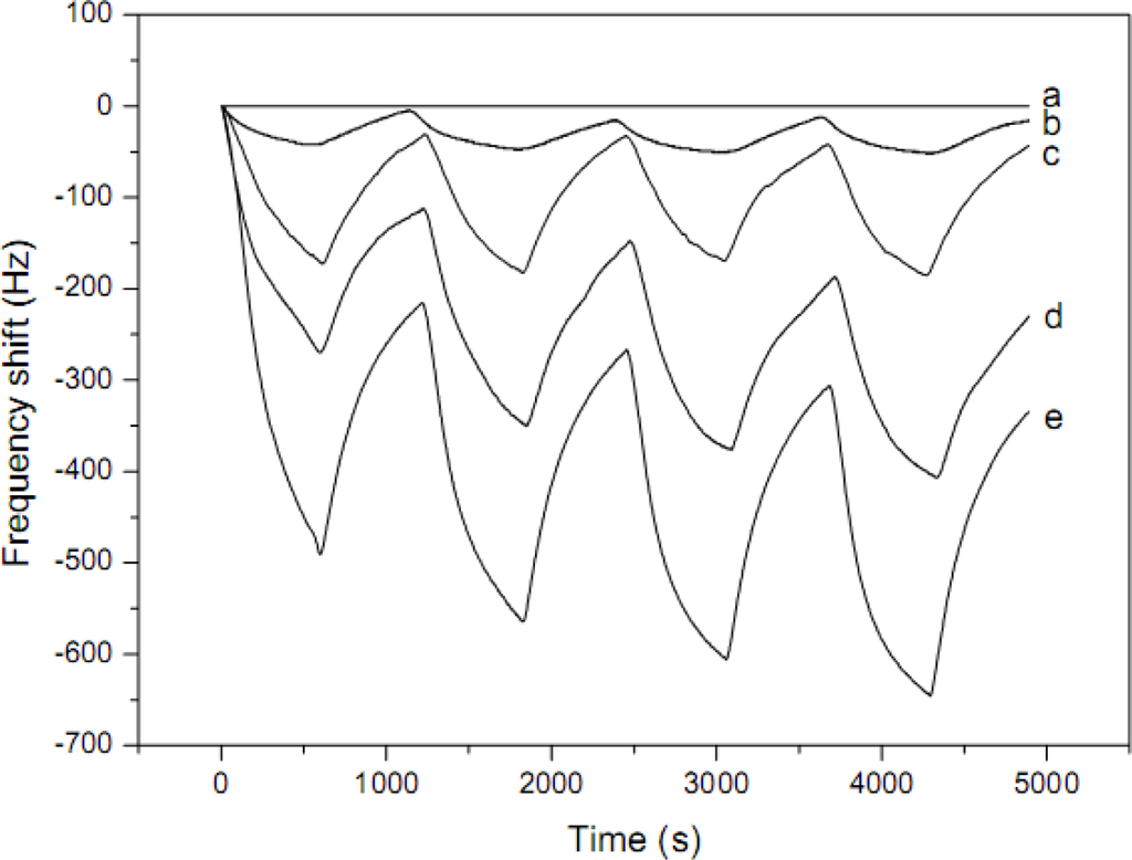 However, the fiber QCM sensors could not detect low concentrations of ammonia gas at very low relative humidity. Therefore, the pre-sorbed moisture in fibrous membranes was proven to be the key factor affecting the sensitivity of QCM sensors for ammonia. Furthermore, the fiber-coated QCM sensors were found to have cross-sensitivity to ammonia and H2O, and the sensitivity of these sensors to moisture was much higher than to ammonia. Hence, they have a strong potential application in humidity sensors. Nanoporous films consisting of weak polyelectrolytes and TiO2 nanoparticles fabricated by a layer-by-layer (LBL) self-assembly method were applied on the electrode of QCM as ammonia gas sensors were prepared by Kim et al []. Compared to the sensing performance of nanoporous sensing films (60 Hz response to 10 ppm ammonia), the fiber-based gas sensors showed much higher sensitivity (230 Hz response to 5 ppm ammonia). However, the polyelectrolyte fibers are not as stable as the nanoporous hybrid LBL films in high humid atmospheres. Further design to enhance the insolubility of the fiber in water is needed.