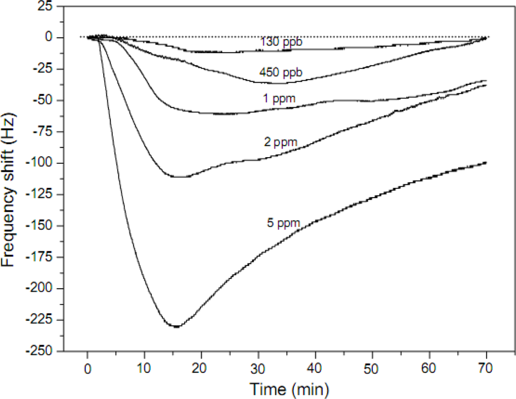Response of the fibers coated QCM sensors with 10,000 Hz coating load exposed to various concentration of ammonia. The PAA fibrous membrane was obtained from the solvent of H2O and the relative humidity was 40% (reproduced with permission from ref. []).