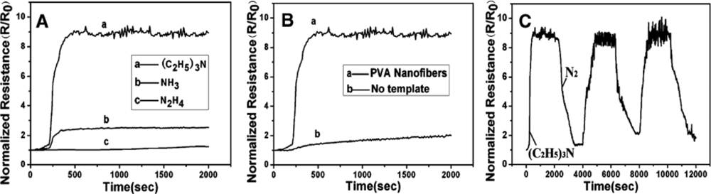 (A) Resistance change of PANI nanotubes exposed to 100 ppm of different gases (NH3, N2H4, and (C2H5)3N). (B) Response of PANI prepared by using PVA fiber mats as the template and without a template upon exposure to 100 ppm of (C2H5)3N. (C) The reversible circulation response change of PANI nanotubes upon exposure to 100 ppm of (C2H5)3N. (reproduced with permission from ref. []).