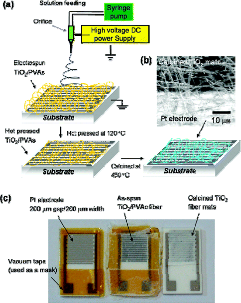 (a) Schematic diagram of the processing steps used to fabricate TiO2 nanofiber mats on Al2O3 substrates with interdigitated Pt electrode arrays. (b) Scanning confocal laser micrograph of a calcined TiO2 nanofiber mat on top of the Al2O3 substrate (dark region) and Pt electrode (bright region). (c) Optical micrographs of gas sensor test devices (10 mm × 15 mm) with TiO2 nanofiber mats after different processing steps. (reproduced with permission from ref. []).