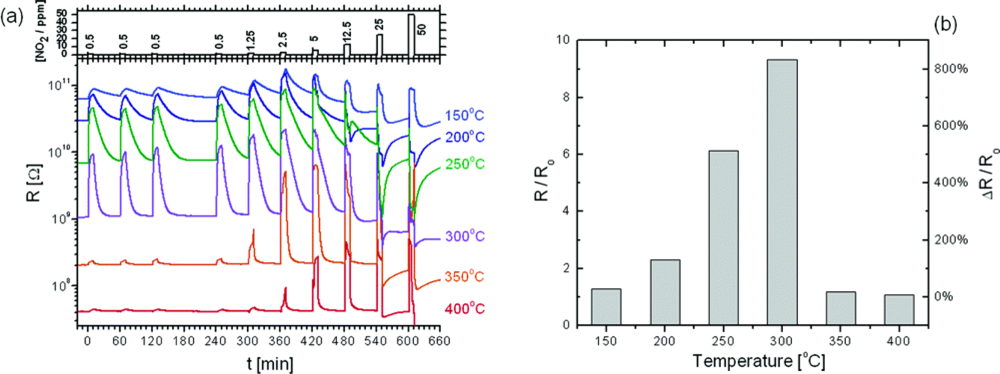(a) The resistance response during cyclic exposure to 10 min pulses with increasing concentrations of NO2 mixed in dry air at various operating temperatures. (b) Sensitivity versus temperature histogram upon exposure to 500 ppb NO2 in dry air. R0 designates the baseline resistance in dry air. (reproduced with permission from ref. []).