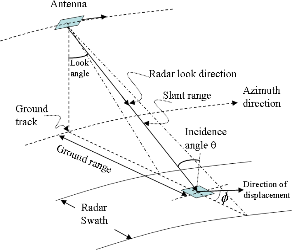 Radio detection and ranging (radar) is basically a tool for measuring the returned signal from the target and the distance between the target and the radar emitter (antenna). In contrast to real aperture radar systems, SAR makes use of the Doppler effect of the motion of platforms (satellite or aircraft) to increase the “aperture” and thus the resolution of the images. For imaging SAR, an electromagnetic (EM) wave pulse is emitted repeatedly in the cross-track direction (direction perpendicular to the moving direction of the antenna; Figure 1). The wave travels through atmosphere which contains electrically charged particles, aerosol and clouds, etc.; interacts with ground surface, and then part of the signal is scattered back to the receiving antenna.