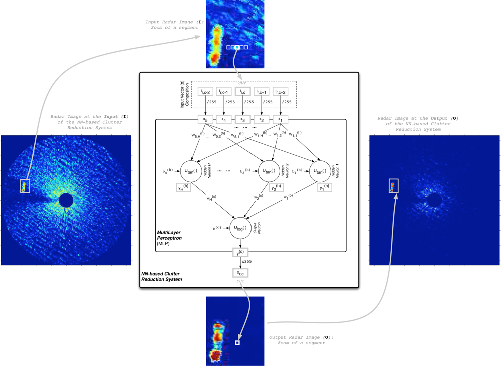 Independently of the MLP stage (design or test), the way the NN-based clutter reduction system processes the data of the radar measurements included in the input radar image (I) to obtain the processed output radar image (O) is summarized in Figure 3. This figure shows how the MLP output y(o) is obtained for a cell under test (CUT). Moreover, it is also shown how this output is assigned to the corresponding cell of the output radar image (or,c), which is established by the r-th row and c-th column of the CUT in the input radar image. Note that only one MLP output is selected because the objective is processing each valid cell of the input radar image and obtaining an output radar image of the same size as the input one. In our case of study, a total of 5 radar return measurements for different positions (range and azimuth) are considered, where they are selected from horizontal radar image raw data. Note that due to the circular symmetry of the coverage and the freedom of waves movement and ships navigation (they can move in whatever direction), a vertical orientation could be selected obtaining similar system performances. Other choice could be use a different shape of selecting the surrounding data of the CUT, what could be studied in the future. Moreover, note that from these 5 selected measurements of I for each CUT, the central element (ir,c) corresponds to the CUT, and the others correspond to surrounding measurements, where a symmetric distribution of the selected data is done. This symmetric selection is done in order to have the same quantity of information from both sides. This number of measurements (empirically obtained) is selected as a trade-off between the system performance, the MLP computational complexity and the size of the targets (ships) under study. Note that 5 cells with a range resolution of 7.5 m (see table 1) involve a distance of 37.5 m, which is the minimum range necessary to englobe the beam of all the ships under study (see table 2 of subsection 4.1.) in case they are perpendicularly placed with respect to the orientation of the selection of input data. As can be observed, the MLP architecture depends on the characteristics of the target to be enhanced. On the other hand, following the nomenclature established in Figure 3 and taking into account the dynamic range of the input data (8 bits: dynamic range of [0 − 255]), the processed output (or,c = round(y(o) · 255)) for a given CUT and its surrounding cells, which are contained in the input vector x = [x1, x2, x3, x4, x5] = [ir,c−2, ir,c−1, ir,c, ir,c+1, ir,c+2]/255, is given by: