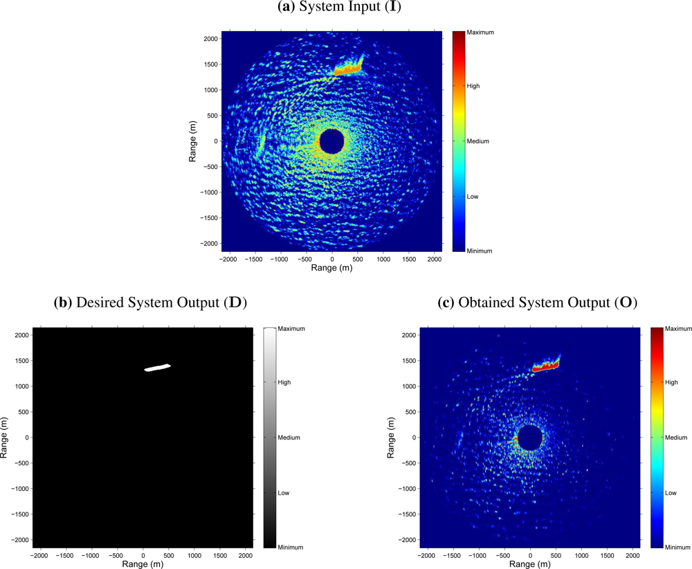 Next, the procedure to obtain the desired outputs (radar images) is exposed. The desierd output image will be a binary image, where a cell of this image with a value of 1 indicates that a target is present there, whereas a value of 0 indicates that target is absent (clutter). The desired outputs are only necessary to design the system (learning if target is present or not in a cell), because, once it is already designed, it will work without any knowledge related to whether a target (ship) is present in the radar scene (in a cell) or not. Nevertheless, we also create the desired outputs of the system in the test stage in order to give an objective measurement of its performance, remembering that this step will not be done when the proposed system is working at steady state. The procedure to obtain the desired radar images at the output of the system in our experiments is: