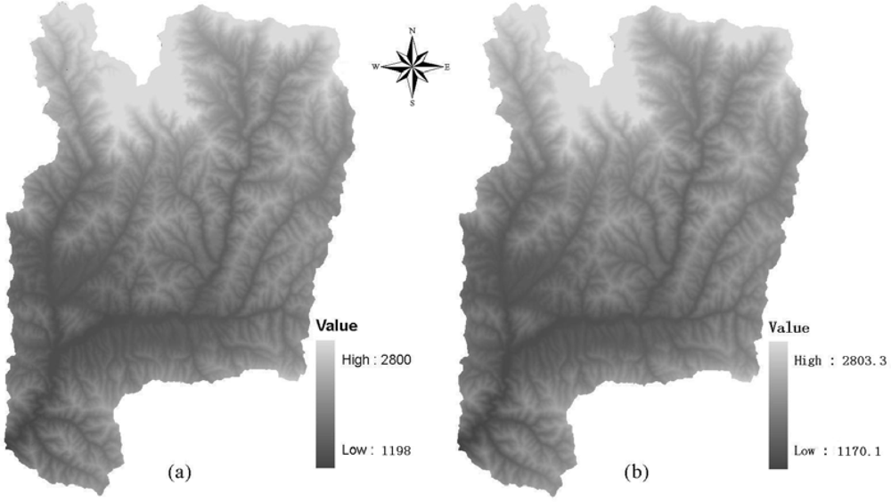 Different spatial resolution DEMs of the Yangjiahe river watershed, (a) represents the 30m DEM constructed with 1:50,000 topographic map; (b) represents the 30m DEM re-sampled with 90 m SRTM DEM.