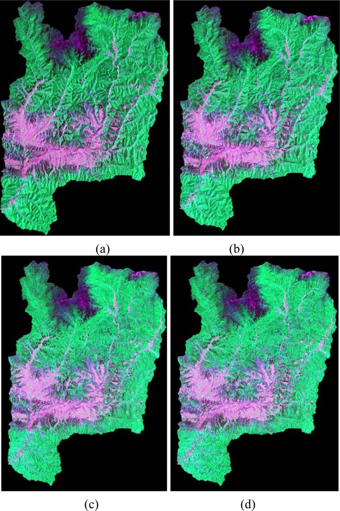 Figure 2 shows the false color composite image (ETM+ 5-4-3) before topographic correction, from which we can find that serious topographic effects appears on the image: the radiance in shaded areas show less than in sunny areas. Figures 3 (a)–(d) show the false color composite images (ETM+ 5-4-3) of the Yangjia river watershed after SCS and Minnaert correction under the support of different resolution DEMs, respectively. Figures 3(a) and (c) are based on SRTM DEM and Figures 3 (b) and (d) are based on DEM constructed from 1:50,000 scale topographic map.
