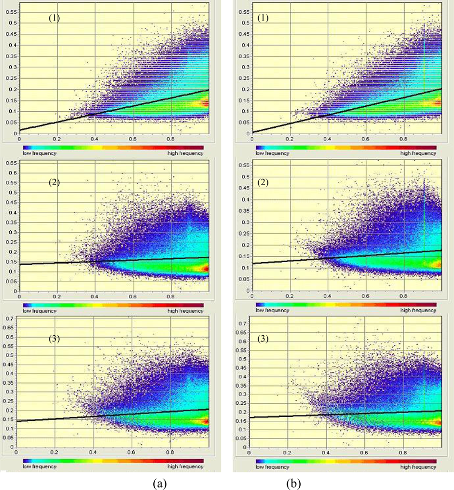 S scatter plots and the linear regression fitting lines of reflectance ρ versus cosi for ETM+ band 1 before and after correction: (a) based on 90 m SRTM DEM; (b) based on DEM constructed from 1:50,000 scale topographic map; (1) before topographic correction; (2) SCS correction; (3) Minnaert correction.