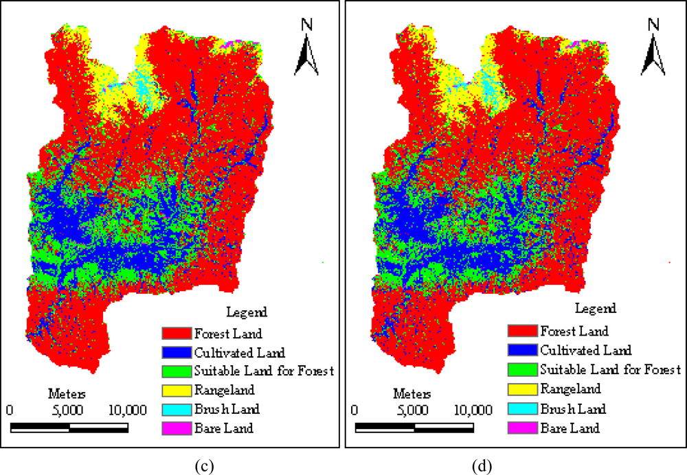 The image was classified using a six category classification scheme, and the six classification categories consisted of forest land, cultivated land, suitable land for forest, rangeland, brush land and bare land. Spectral signatures were created for these six LULC classes of interest using the training data provided from the geographical database, and the classifications were performed using the Gaussian maximum likelihood (GML) classifier. The reason for adopting GML classifier for classification was mainly due to its outstanding performance in considering means, variances and co-variances of training site statistics which favors this classifier, used worldwide and relatively convenient to implement and robust for classification [23]. In this study, four classification schemes were designed as follows: