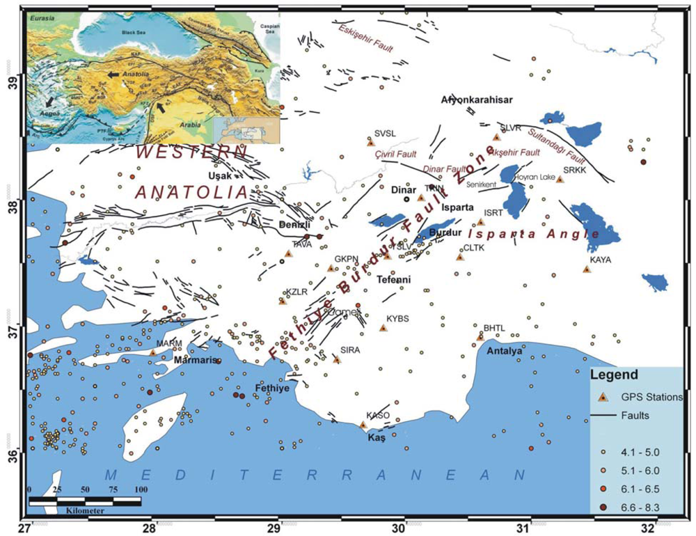Anatolia is one of the most seismically active regions of the Mediterranean basin. Historical seismicity, as well as instrumental recordings of earthquakes occurred in the last 10 years, reveals the active tectonic features of this area. The North Anatolian, East Anatolian, Aegean, and Burdur-Fethiye fault zones, point to the tectonic diversity and activity of Anatolia. Since the mid 1980s, the Global Positioning System (GPS) has provided earth scientists with new opportunities to estimate present-day surface kinematics and Earth’s crust deformations [1,2]. In the eastern Mediterranean, previous GPS studies have helped quantify large-scale plate motions [3,4], regional deformation in the zone of plate interaction [5–7], and deformations associated with the earthquake cycle [8]. GPS studies conducted in recent years have demonstrated the presence of a recent NE-SW extension in Western Anatolia, which moves at about 30 mm/year towards the southwest [7].