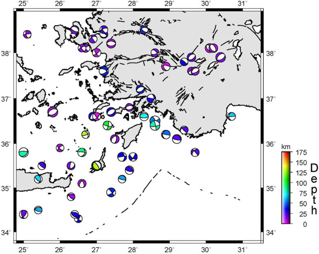 Three main earthquakes of magnitudes ranging between 6.1 and 7.1 occurred in the region in 1914, 1957, and 1971 in the last century. Figure 2 illustrates the focal mechanisms of the earthquakes (M>5.5) that took place in SW Turkey and in the vicinity of NE Hellenic Arc region. Most of the fault plane solutions of the events since 1977 are taken from Harvard Centroid Moment Tensor (CMT) catalogue. Also, the focal mechanisms of the 1914 Burdur earthquake (M=6.9) and the focal mechanisms of the 1957 Fethiye-Rhodos earthquake (M=7.1) are included. These are the largest two events to have affected the study region [19] (Figure 1).