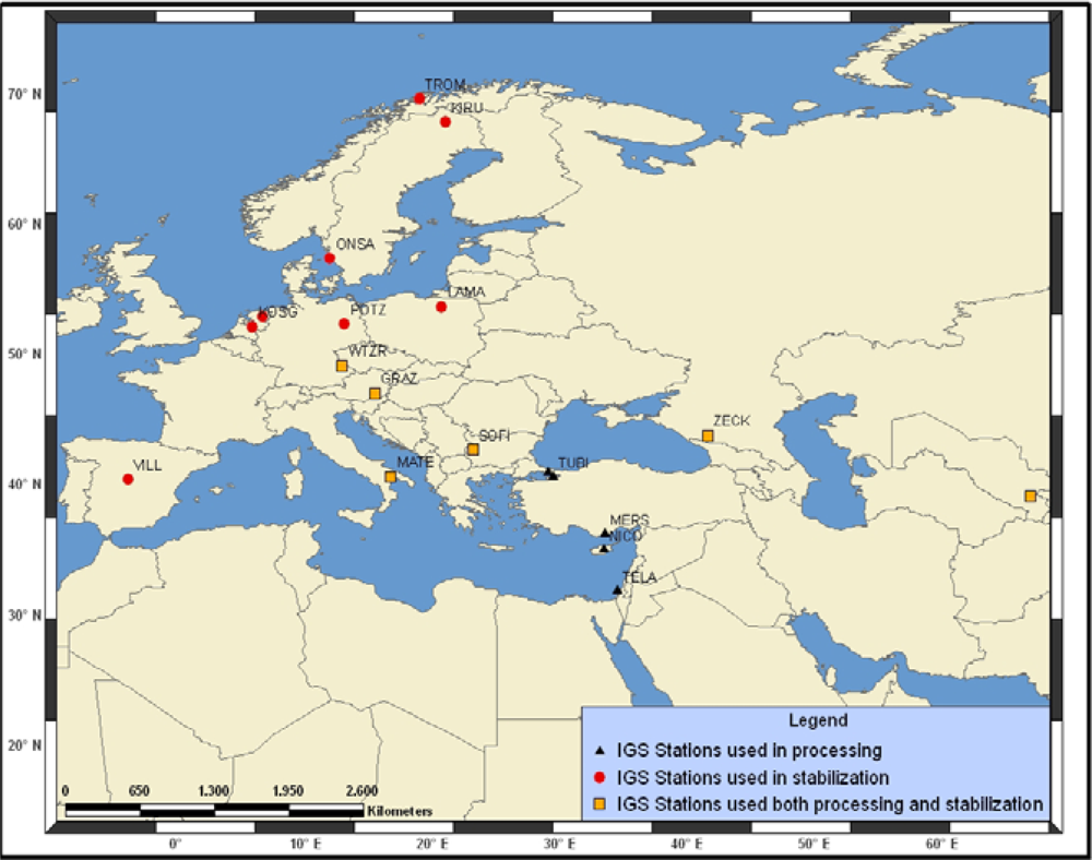 In the second stage, site coordinates, satellite coordinates, and covariance matrices were analyzed by Kalman filtering, without forcing, to obtain accurate velocities and coordinates. To provide stabilization during this stage, local solutions and global IGS solutions edited by SOPAC were evaluated, as well [7]. After stabilizing reference frame in the third stage, a reference system (European frame) was defined and velocity estimations were resolved to a European fixed reference frame that facilitates assessing the local deformation. Different site combinations were used for reference system definition. Horizontal velocities given by ITRF00 a-priori coordinates were minimized, and a Eurasian reference system was defined [7].