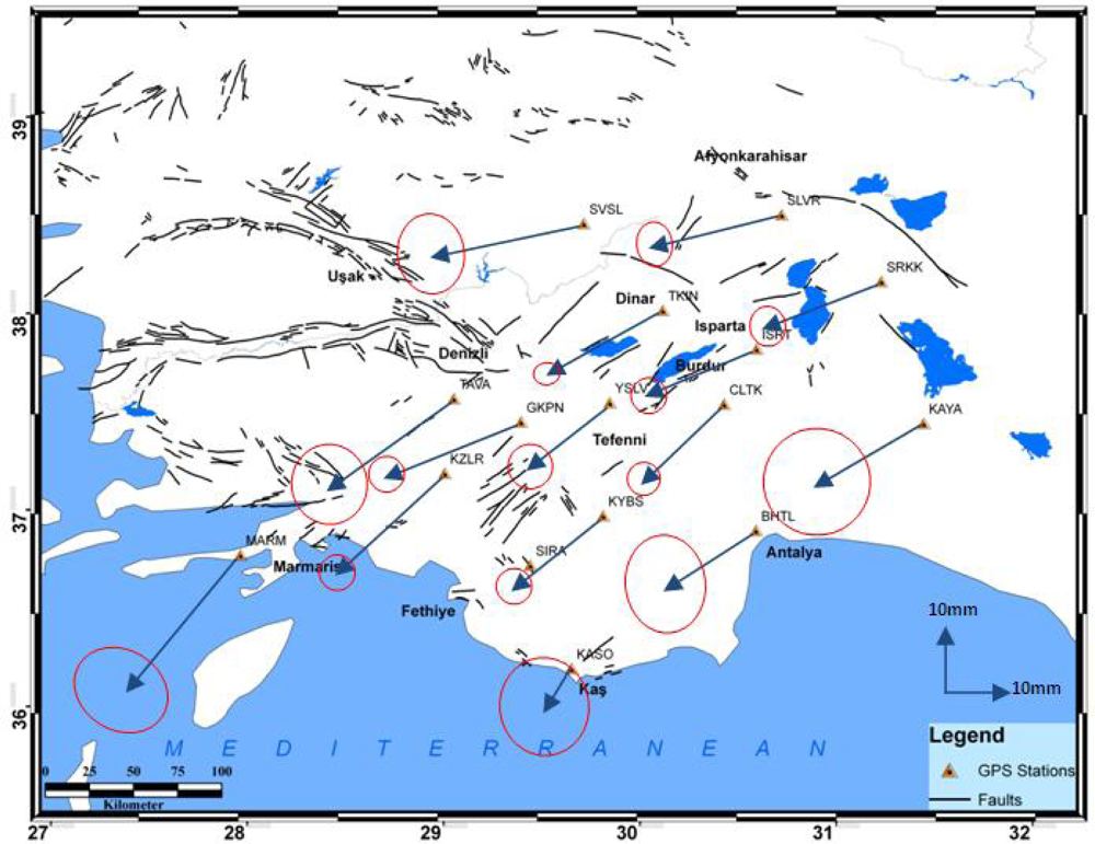 McClusky et al. [7], as a result of the GPS surveys which they conducted for 189 points within a nine-year period between 1988 and 1997, calculated the Euler pole rotation values for the Eurasian/Anatolian tectonic plate as 30° 7′ latitude, 32° 6′ longitude, and 1.2 °/Ma. Employing these data, velocity values were computed for the points located on the Burdur-Fethiye fault zone. In the subsequent stage, local deformations were determined from the differences between the velocities of these points and those calculated on the basis of Euler values. To understand the differences in the movements of the region, the residual values of the Euler velocity vector values are shown in Figure 5.