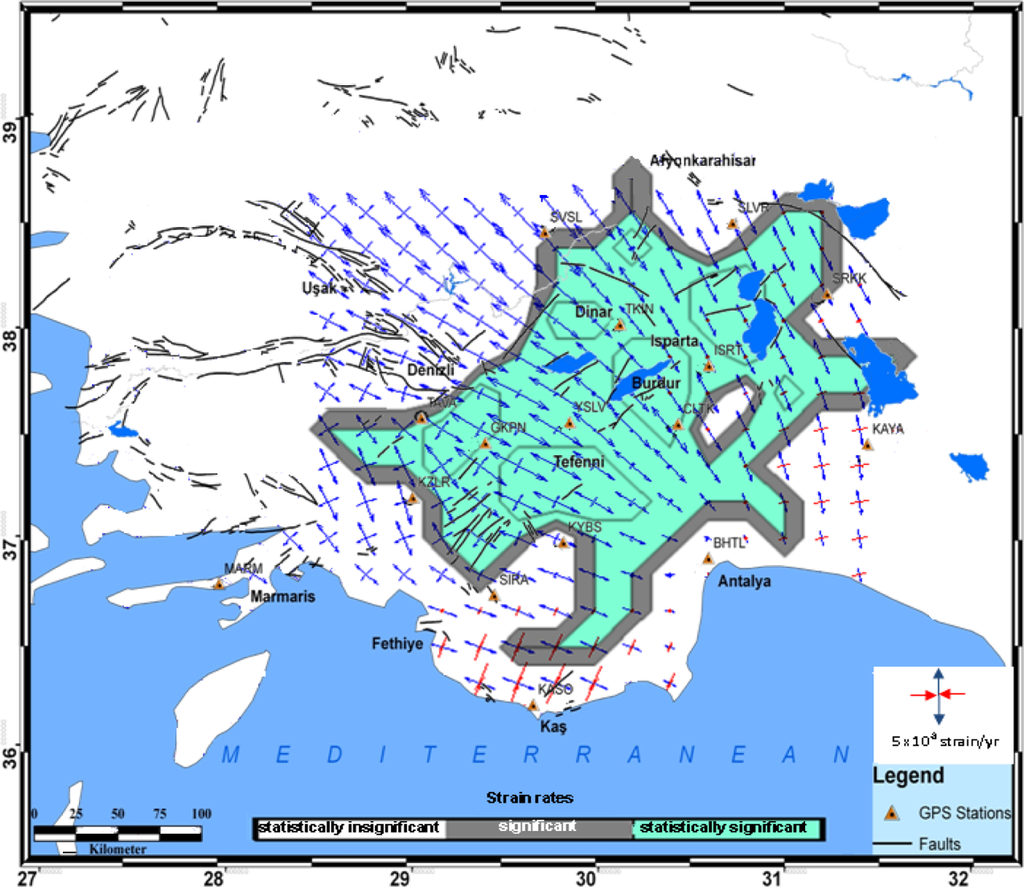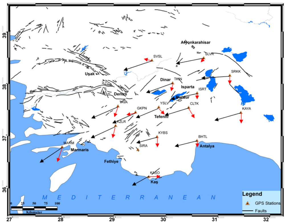 During the last 40 years, the region has been extensively studied and mapped and recent publications show the paleotectonic structure of the region. However, active crustal extension has never been observed in the regions of Isparta and south of Burdur [9]. Barka et al. [10] indicated that velocity vectors located in the vicinity of the Burdur-Fethiye Fault zone are oblique to main trend of the fault zone. The slip vector obtained from inversion solution of the Dinar earthquake is nearly parallel to that obtained from GPS surveys. This direction of the slip vector is expected to cause normal faulting along the Dinar Fault with slight right-lateral component, and combination of left-lateral and extension along the Burdur-Fethiye Fault zone. The 1971 Burdur earthquake indicated pure normal faulting parallel to the Burdur-Fethiye Fault zone [10]. Although the region has been studied and mapped, any specific model related to the region could not be concluded. The aim of this study is to reveal the updated kinematics related with strain rates, and deformations of the region.