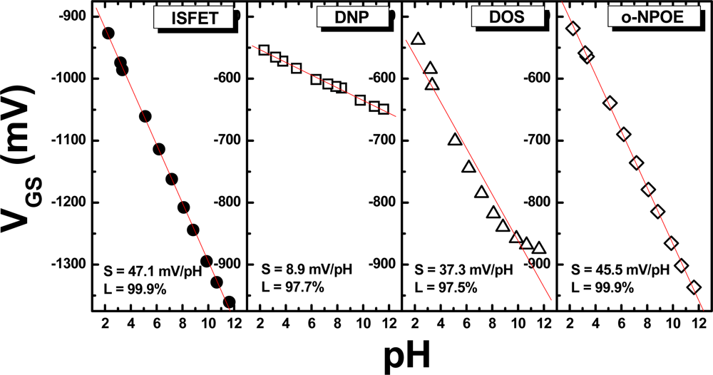 pH sensitivity of (a) a Si3N4 ISFET without a PVC membrane, and REFETs with membranes containing different plasticizers at 70 wt.% composition: (b) DNP, (c) DOS, and (d) o-NPOE.