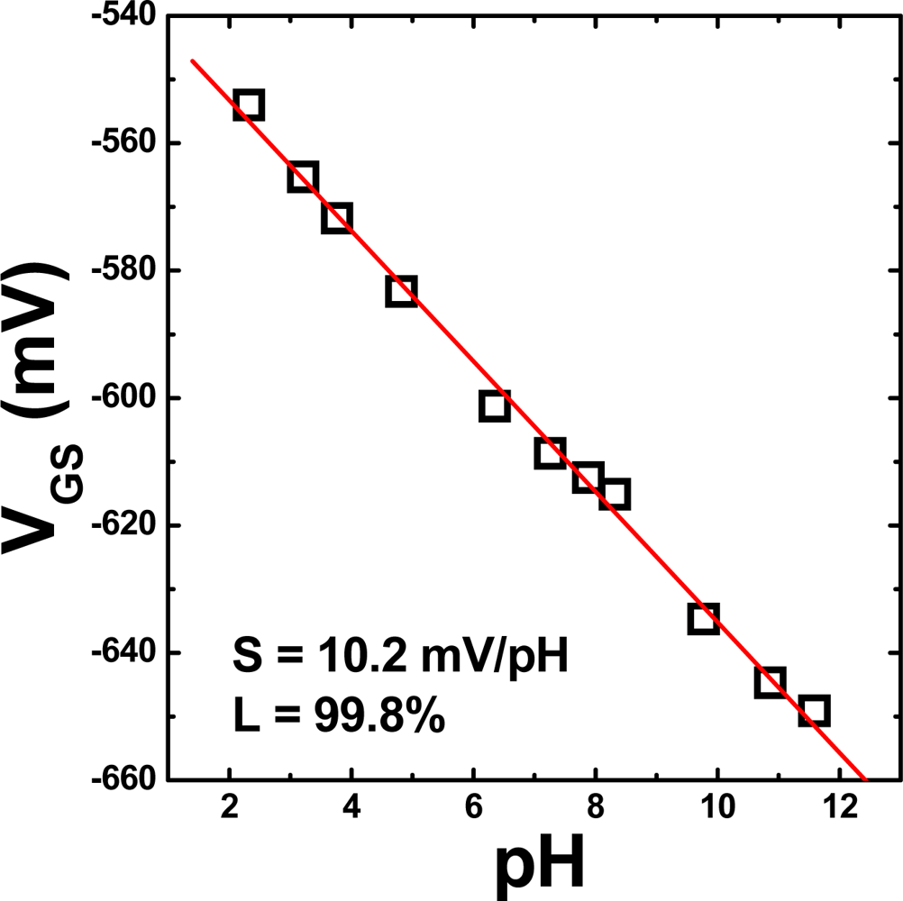 The ion sensitive field effect transistor (ISFET) was first proposed by P. Bergveld in 1970 [1]. Because the device structure and fabrication process are similar for metal oxide field effect transistors (MOSFETs) and ISFETs, both devices can easily be manufactured by CMOS technology and miniaturized to the micrometer scale [2]. In addition, high bio-compatibility and fast responses have led many researchers to investigate ISFETs as platforms for sensing clinically important species, such as penicillin, urea, glucose, creatinine, etc. [3–7]. Based on these advantages, it has been concluded that ISFETs show high potential for application in “home-care” systems and continuous in-vivo monitoring [8].