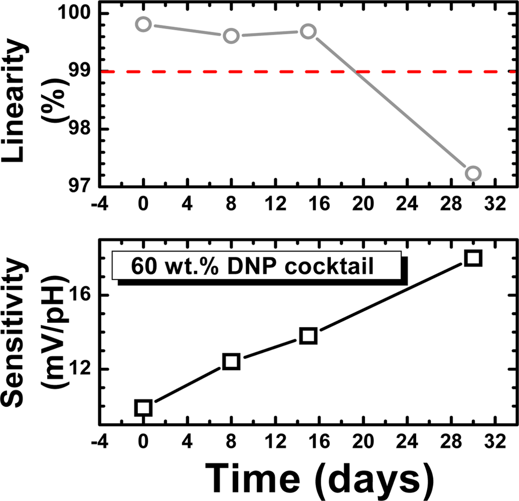 The long term stability and lifetime, which are important parameters for sensor applications, were also investigated. To measure the drift effect of the REFETs, the samples were measured in pH 5.7 buffer solution for 12 hours continuously. The drift coefficient of the REFET with a 60 wt. % DNP membrane was low: −0.74 mV/h. However, after a few days of testing, the reduced pH sensitivity of the REFETs increased, and the linearity degraded, as shown in Figure 4. To evaluate the lifetime of the REFETs, a sensitivity higher than 15 mV/pH and a linearity lower than 99 % were set as the criteria. Based on these criteria, the lifetime of the best REFETs was estimated to be around 15 days.