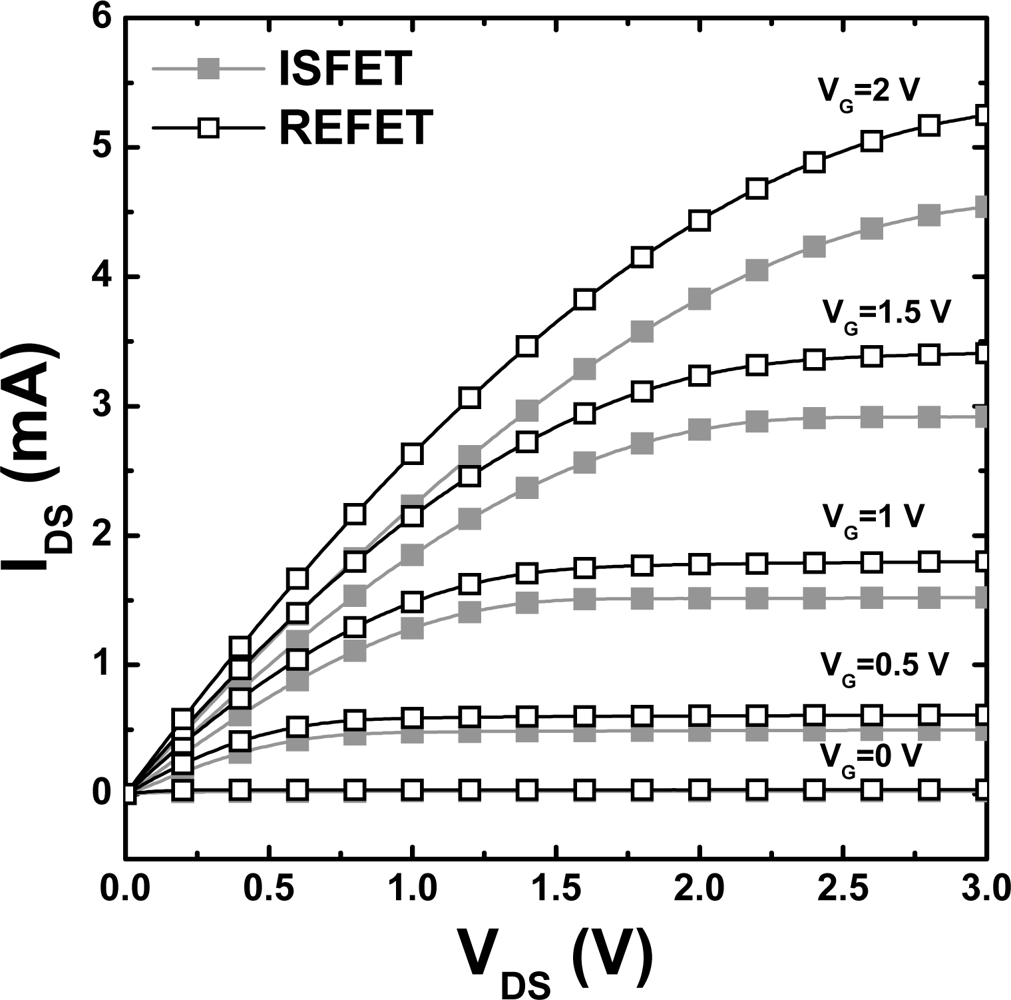 The IDS-VDS curves of ISFETs and REFETs with the gate voltage varied from 0 V to 3 V.