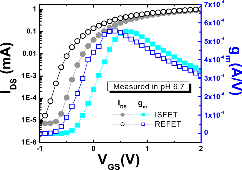 To compare the threshold voltage (VT), the on current (Ion), the off current (Ioff), and the transconductance (gm) of ISFETs and REFETs, the IDS-VGS characteristics were measured in a pH 6.7 buffer solution (results are shown in Figure 6). The Ion and Ioff for ISFETs and REFETs are almost the same, and the Ion/Ioff ratio is about 1.7 × 10−6, which is in the normal operation range for FET devices. The threshold voltage for the REFET was smaller than that of the ISFET. The general expression for the threshold voltage for ISFETs and REFETs is as follows [21]: