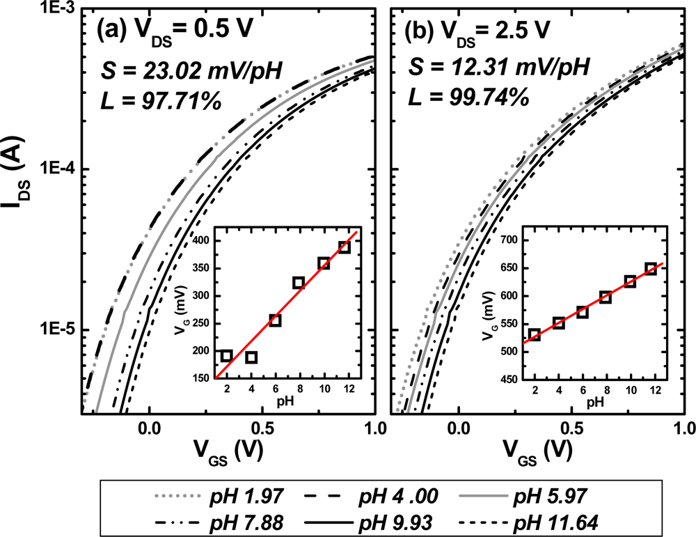 The IDS-VGS and sensitivity of REFETs with (a) VDS = 0.5 V and (b) VDS = 2.5 V. Insets show calibration curves corresponding to IDS-VGS curves.