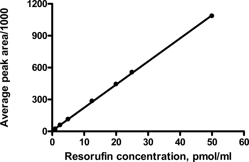 An eight-point standard curve (0.5, 1.0, 2.5, 5.0, 12.5, 20, 25 and 50 pmol/mL) was prepared by adding known concentrations of resorufin to the mixture of buffer-methanol incubation solution (1:1 v/v).